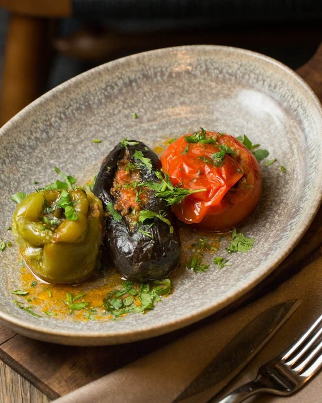 Три ярких овоща — баклажан, помидор и болгарский перец — начиняются мясным фаршем с рисом и зеленью, после чего тушатся вместе в ароматном соусе. Блюдо не только вкусное, но и очень красивое — разноцветные овощи на тарелке радуют глаз.